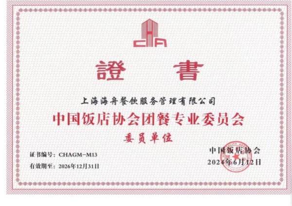 6月12日,海舟公司榮獲“中國(guó)飯店協(xié)會(huì)團(tuán)餐專(zhuān)業(yè)委員會(huì)委員單位”